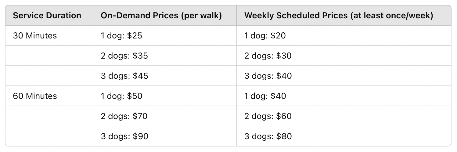 *Additional fees: Add $10 for weekend care and $20 for holidays. *Additional fees may apply for dogs with unique special needs. *Please ensure you provide appropriate walking gear and poop bags. A static lead is required for safe walks in social groups. Additional fees may apply for solo walks.